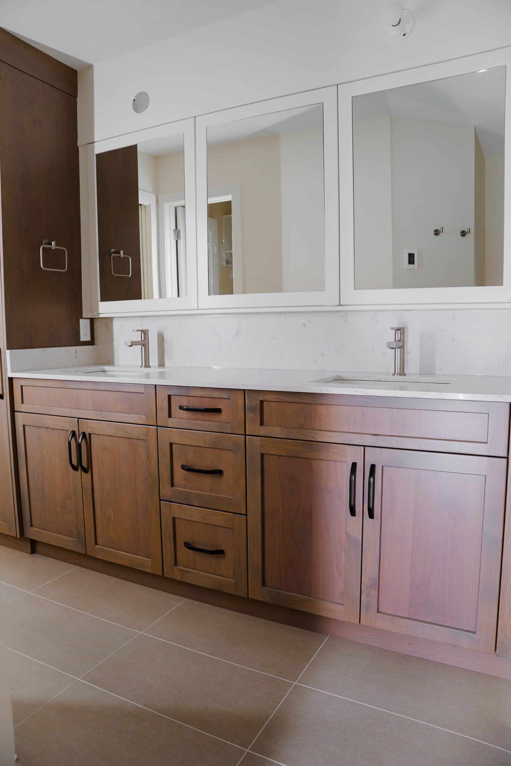 A custom double vanity anchors the room, offering generous countertop space and dual sinks for convenience. We included ample drawer and cabinet storage to keep everyday essentials organized and out of sight. Above the vanity, a bespoke mirrored medicine cabinet provides additional hidden storage and adds a polished, built-in look.