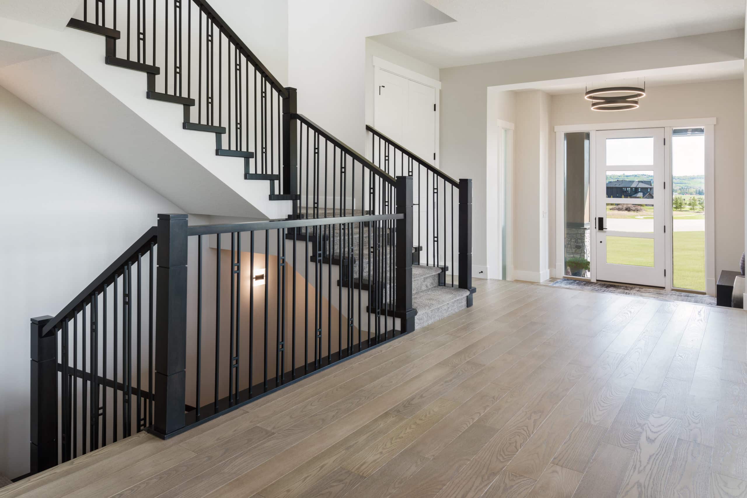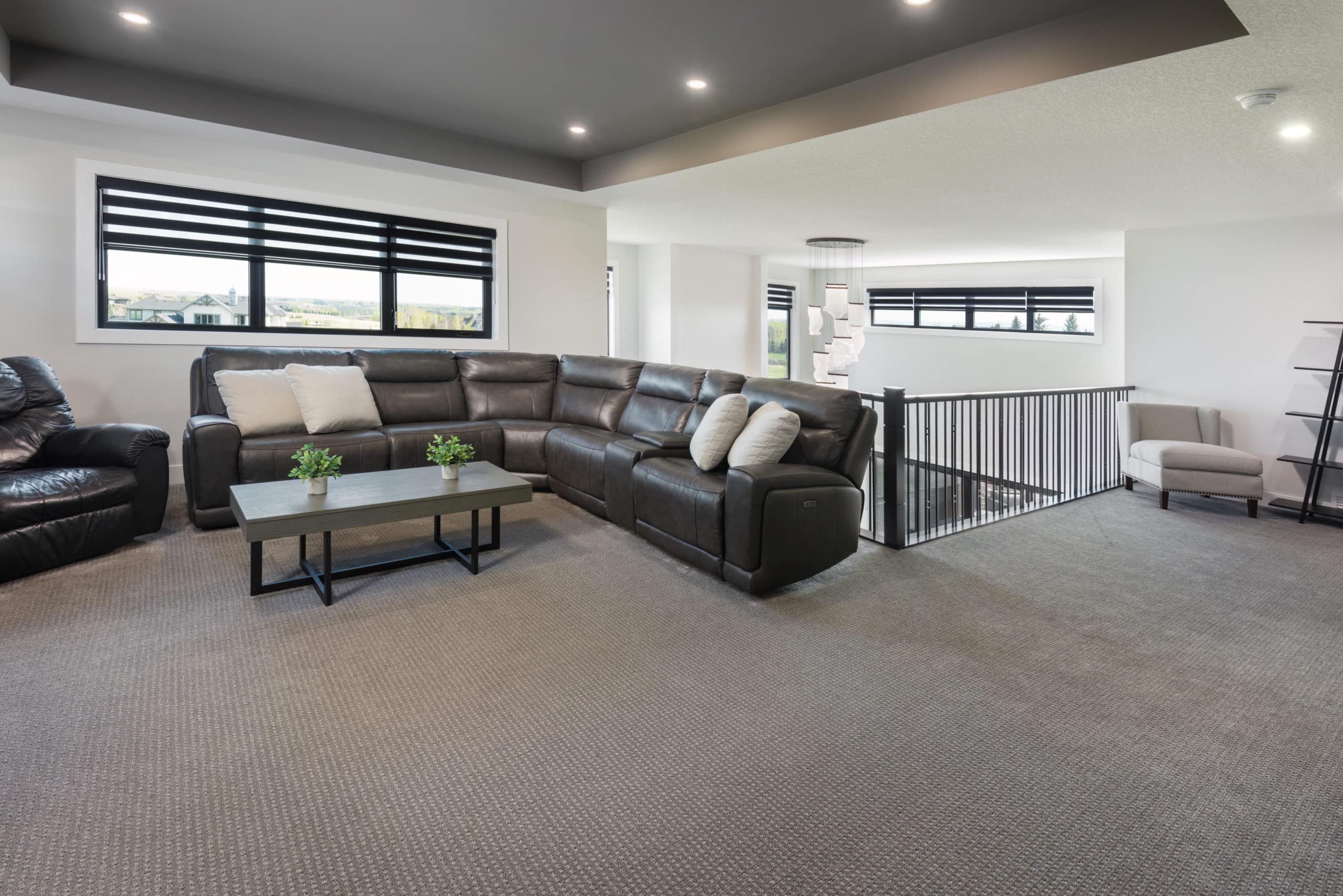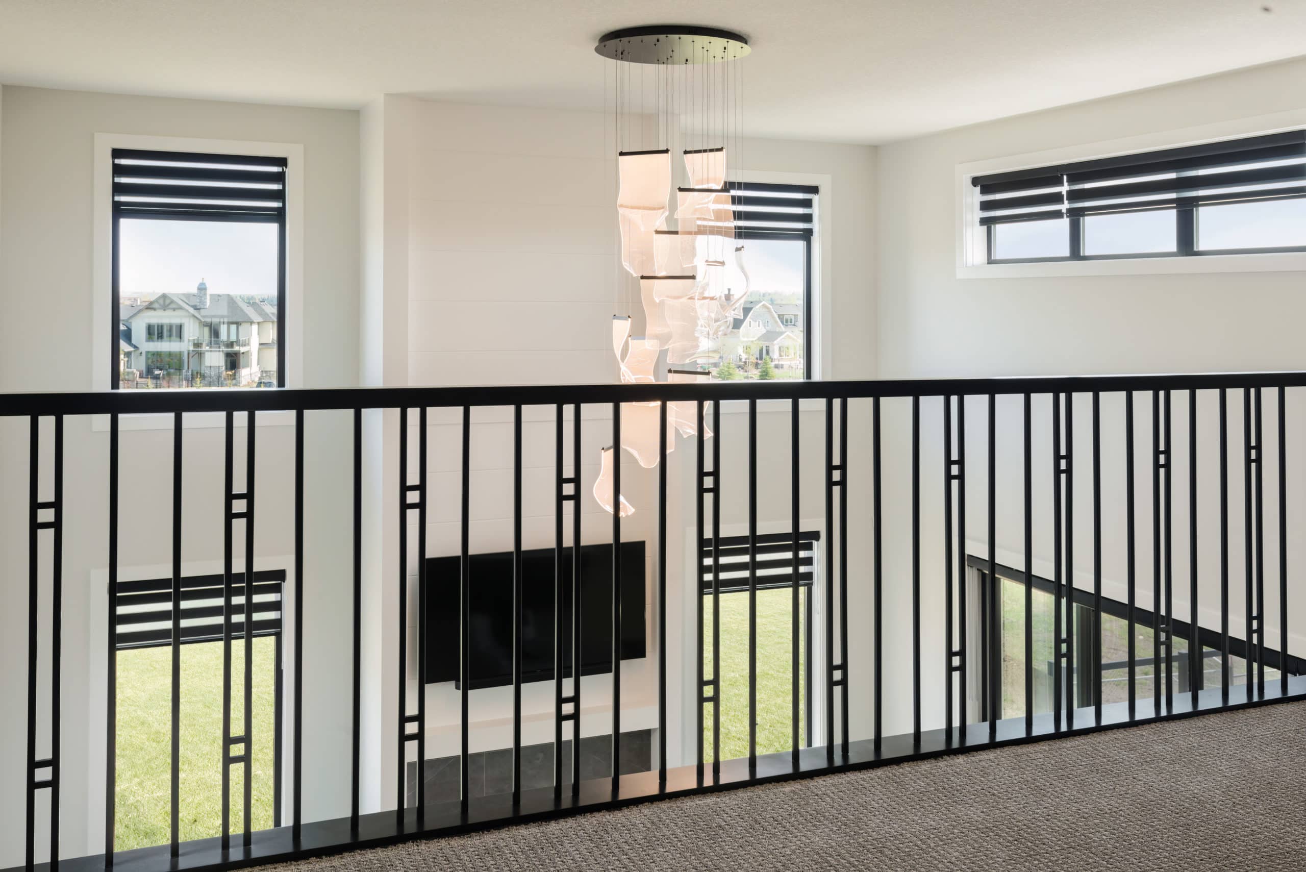 The interior of this Springbank home is where the design vision truly comes to life. Each room is thoughtfully curated to support how the family lives, entertains, and relaxes, striking a seamless balance between visual elegance and everyday practicality. The layout flows effortlessly from one space to the next, fostering connection while still offering moments of quiet retreat. Premium materials and bespoke finishes define the interiors – from the warmth of wide-plank hardwood flooring underfoot to the clean lines of custom millwork and built-in cabinetry throughout. The lighting design plays a key role in enhancing ambiance and function, with a mix of recessed fixtures, modern pendants, and strategically placed sconces that adapt to every mood and time of day. Every design element was chosen not just for its aesthetic appeal, but for its ability to elevate the experience of being at home. Whether hosting a large gathering or enjoying a peaceful night in, the home feels intuitive, comfortable, and undeniably luxurious.