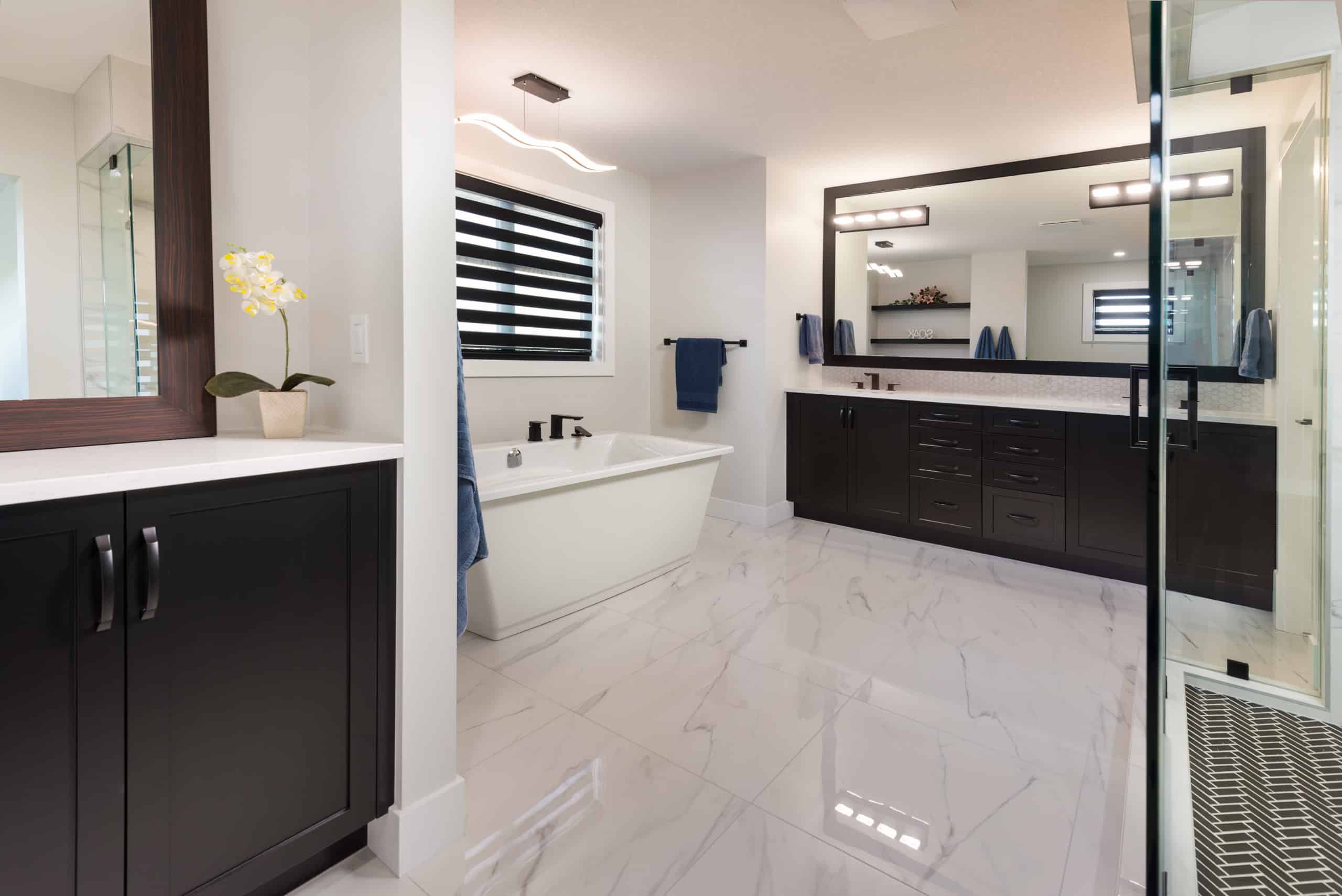 • Primary Bedroom & Ensuite: The primary suite includes a spacious bedroom, walk-in closet with custom shelving, and a spa-like ensuite. Featuring a freestanding tub, dual vanities, and a glass-enclosed shower, this space is designed to rejuvenate both body and mind.