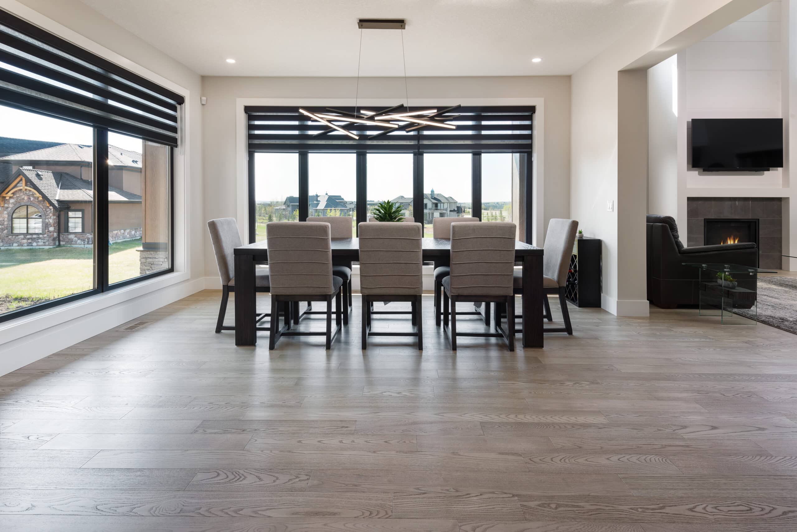 The great room is designed for comfort and connection, anchored by a sleek, minimalist fireplace set within a wall of custom millwork. The hearth, while modern in aesthetic, brings warmth and grounding to the open space, making it an ideal focal point for gatherings or quiet evenings in. A curated blend of materials, textured wood accents, layered textiles, and matte black fixtures gives the room a contemporary yet timeless appeal. Generous seating arrangements and sightlines to the kitchen and dining areas make it easy to stay connected, whether entertaining guests or spending time as a family. Strategically placed windows not only capture beautiful light but also frame views of the surrounding landscape, creating a seamless dialogue between indoors and out.