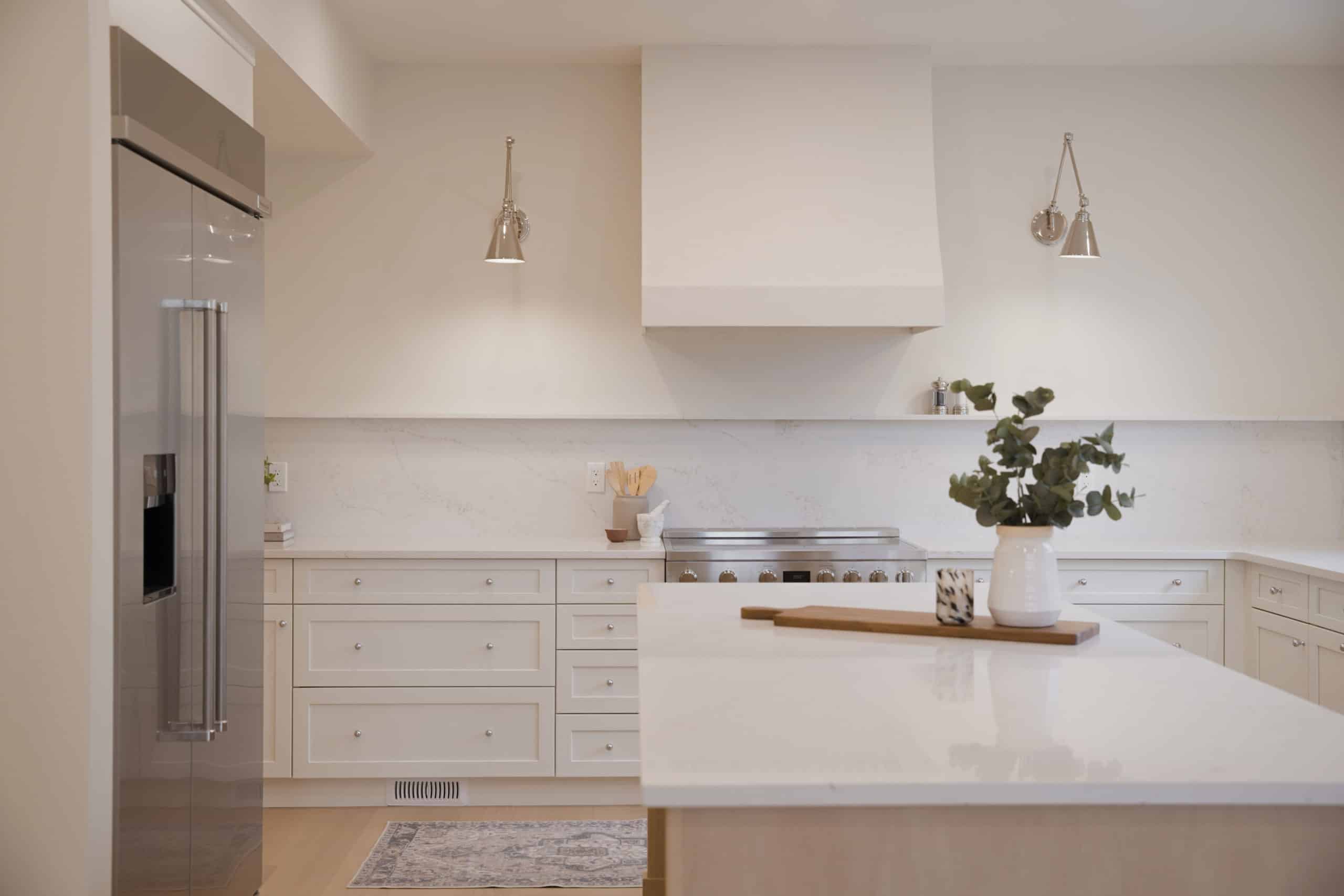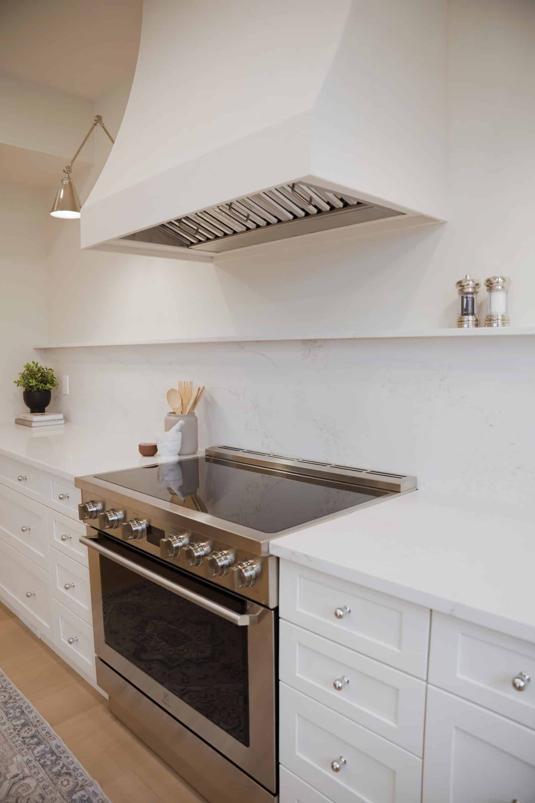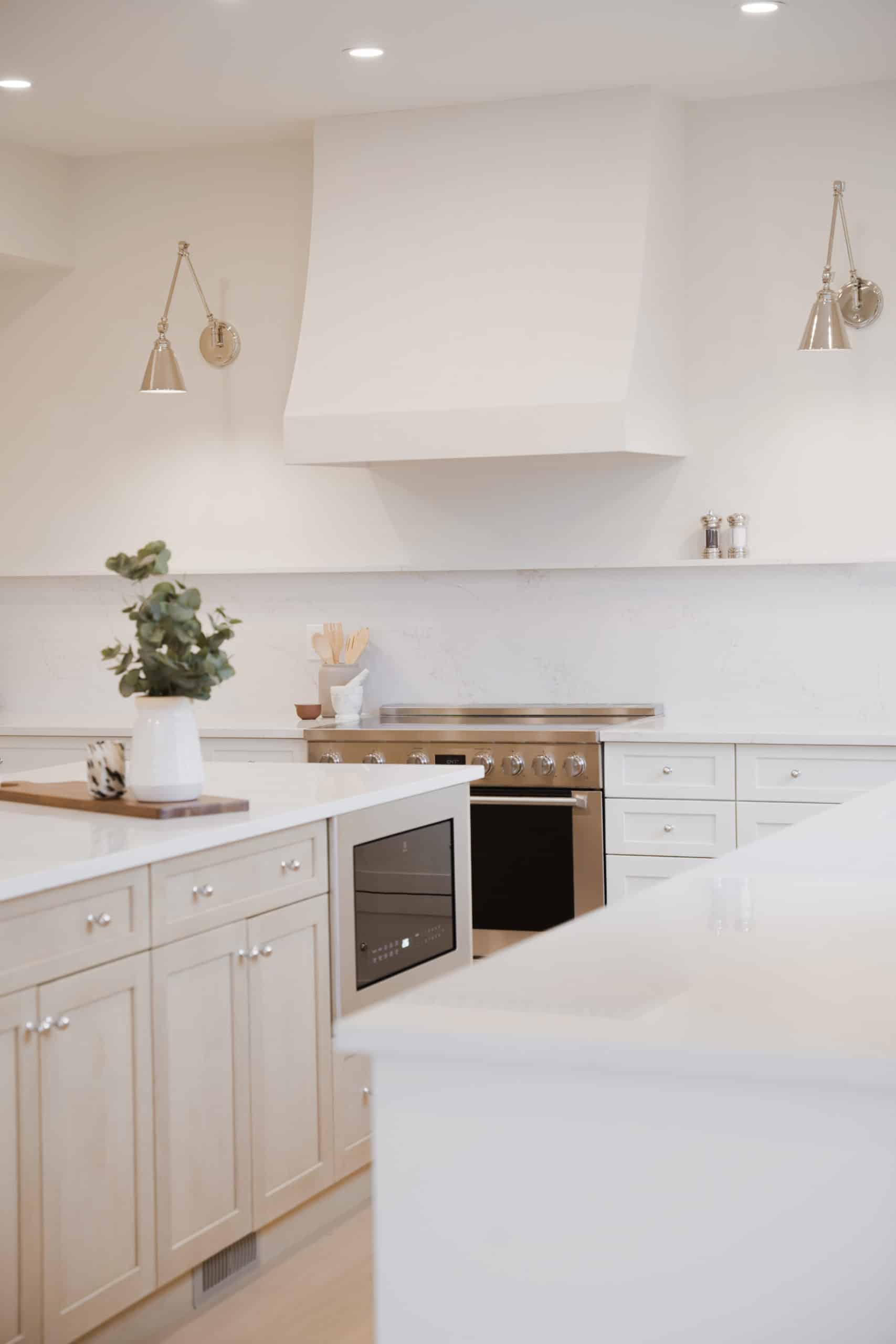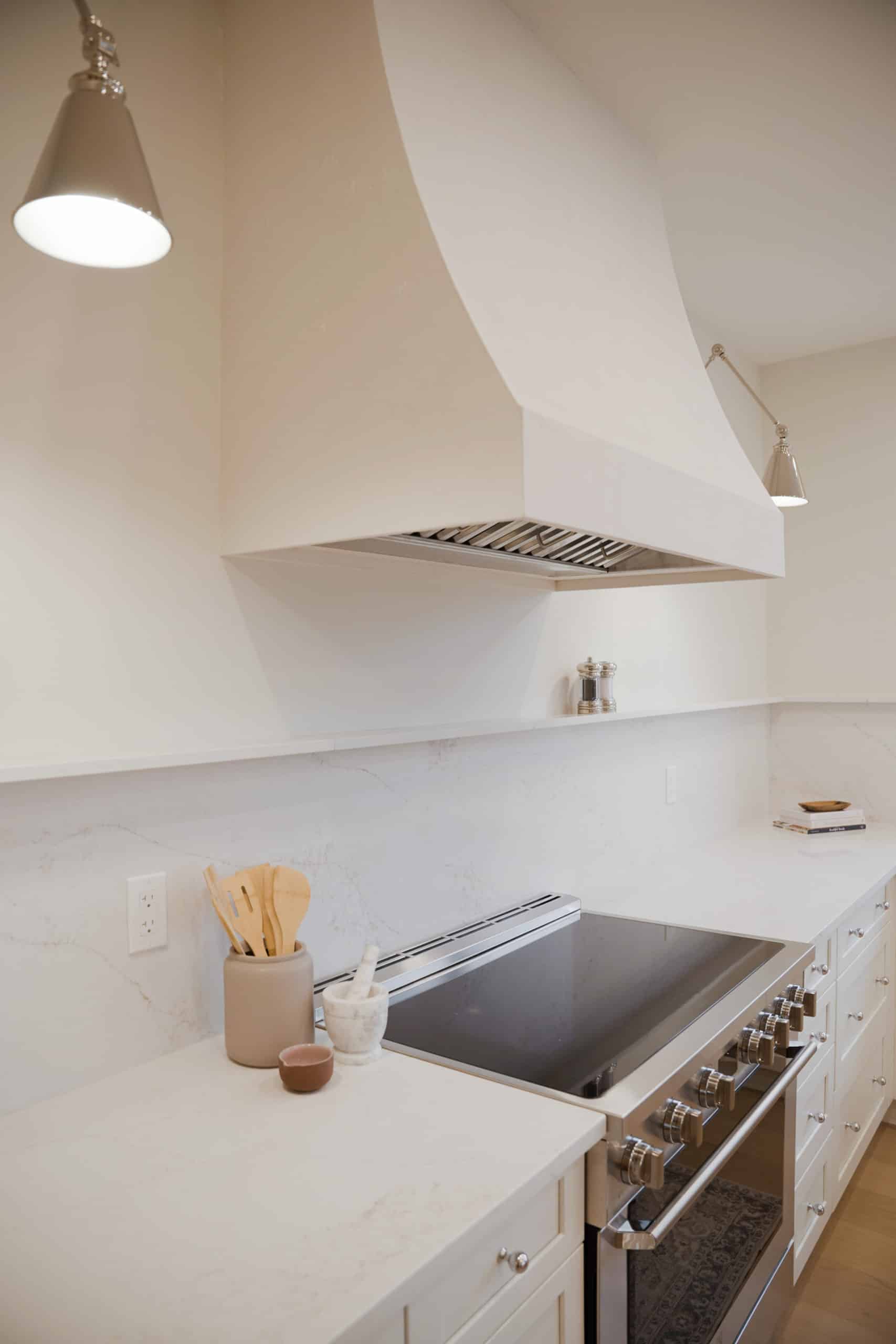 At the heart of the range wall, a custom plaster hood fan cover becomes a sculptural statement, framed beautifully by wall sconces that provide ambient lighting and a touch of architectural charm. The large central island offers a generous workspace, informal seating, and acts as a daily gathering spot for everything from breakfast to homework to hosting friends.