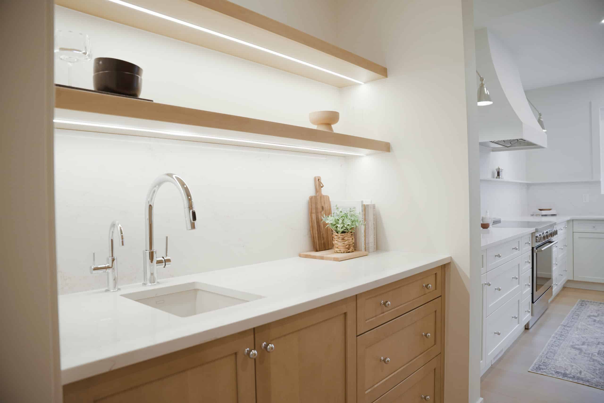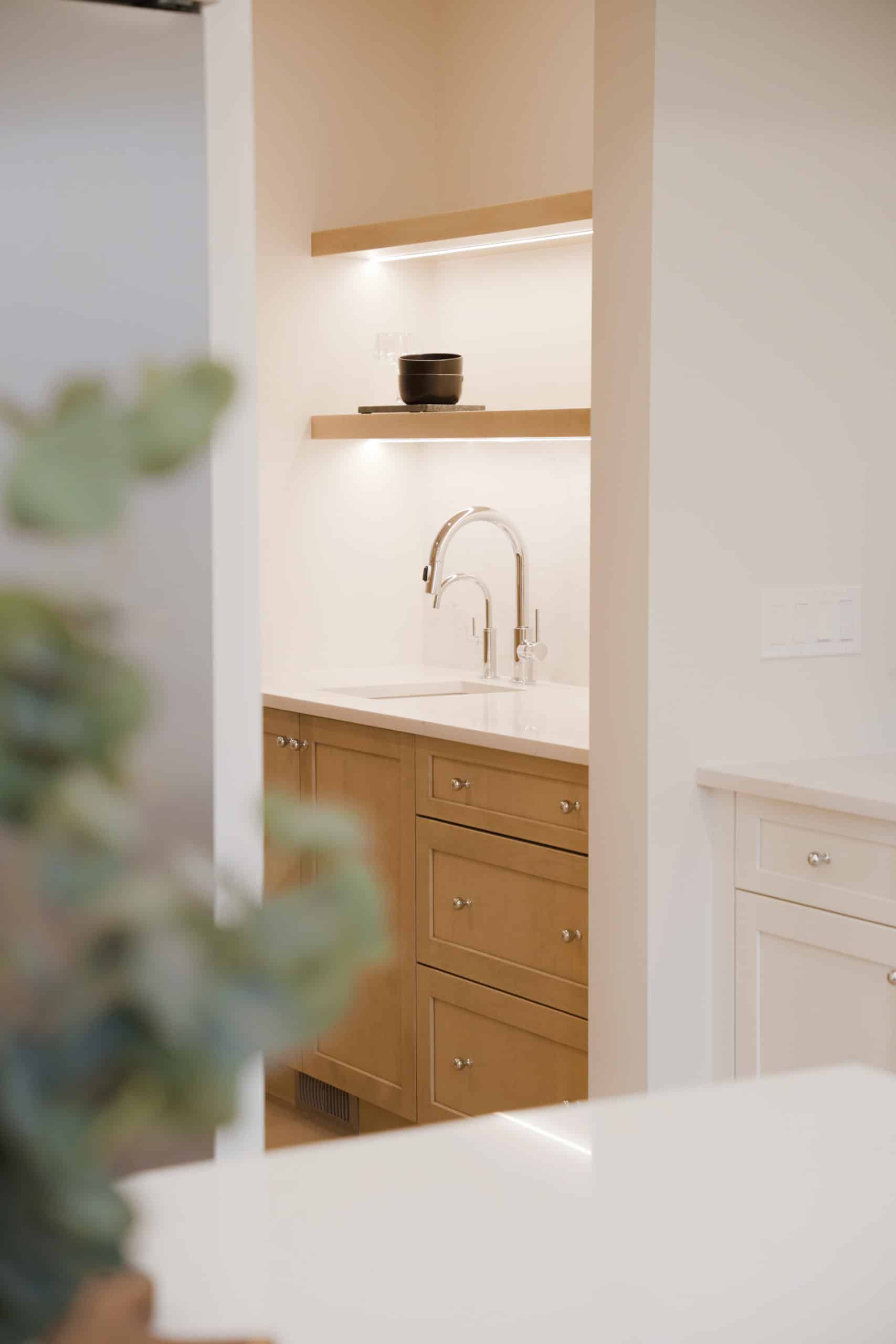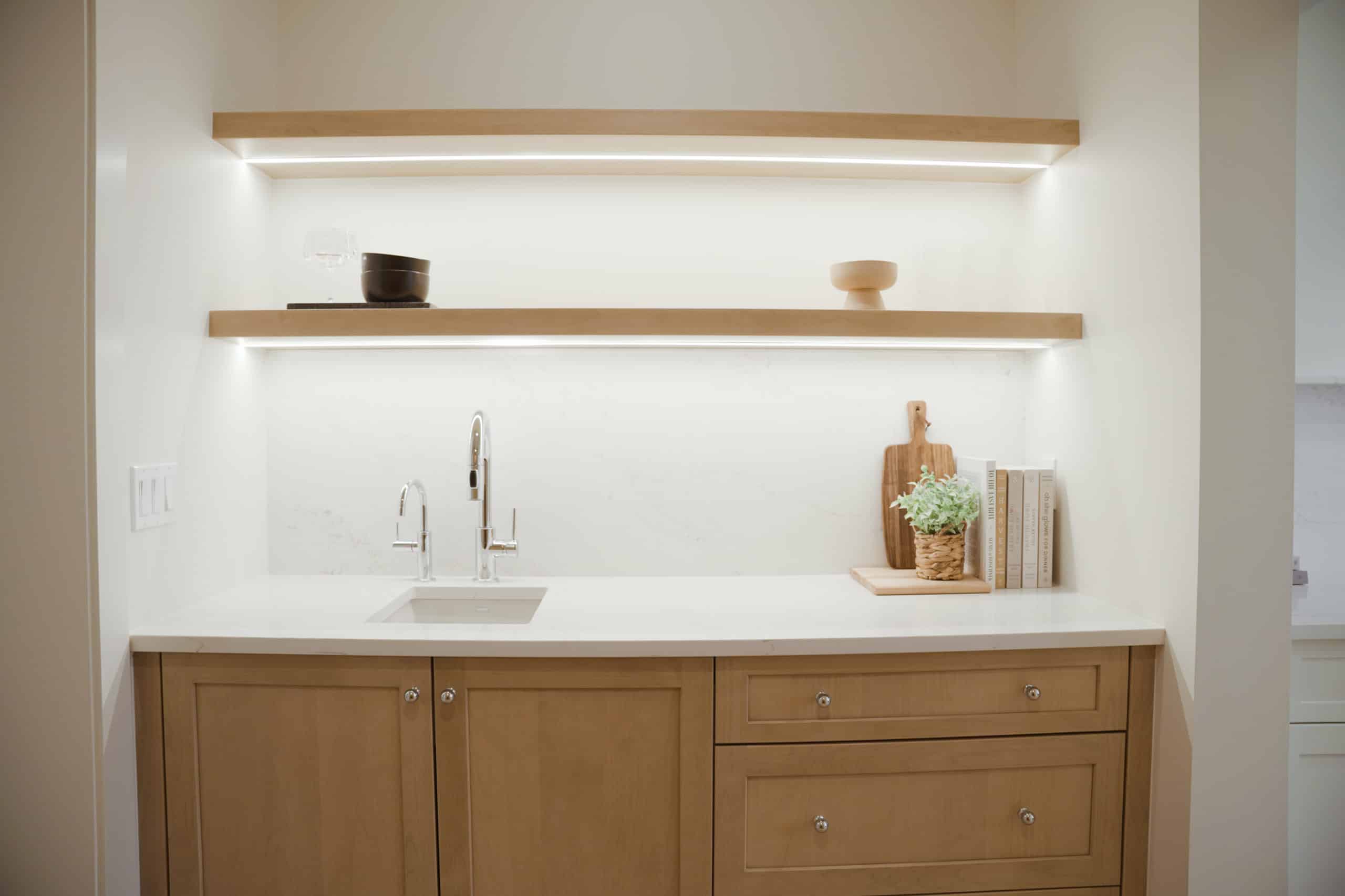 Every detail of this space was carefully considered. We installed custom cabinetry in a soft wood tone, adding a layer of warmth and natural texture to the overall palette. The quartz countertops, paired with a matching quartz slab backsplash and a floating quartz shelf, offer a clean, seamless look that balances beauty with functionality. These subtle design choices speak to a refined modern aesthetic, one that’s both timeless and family-friendly.