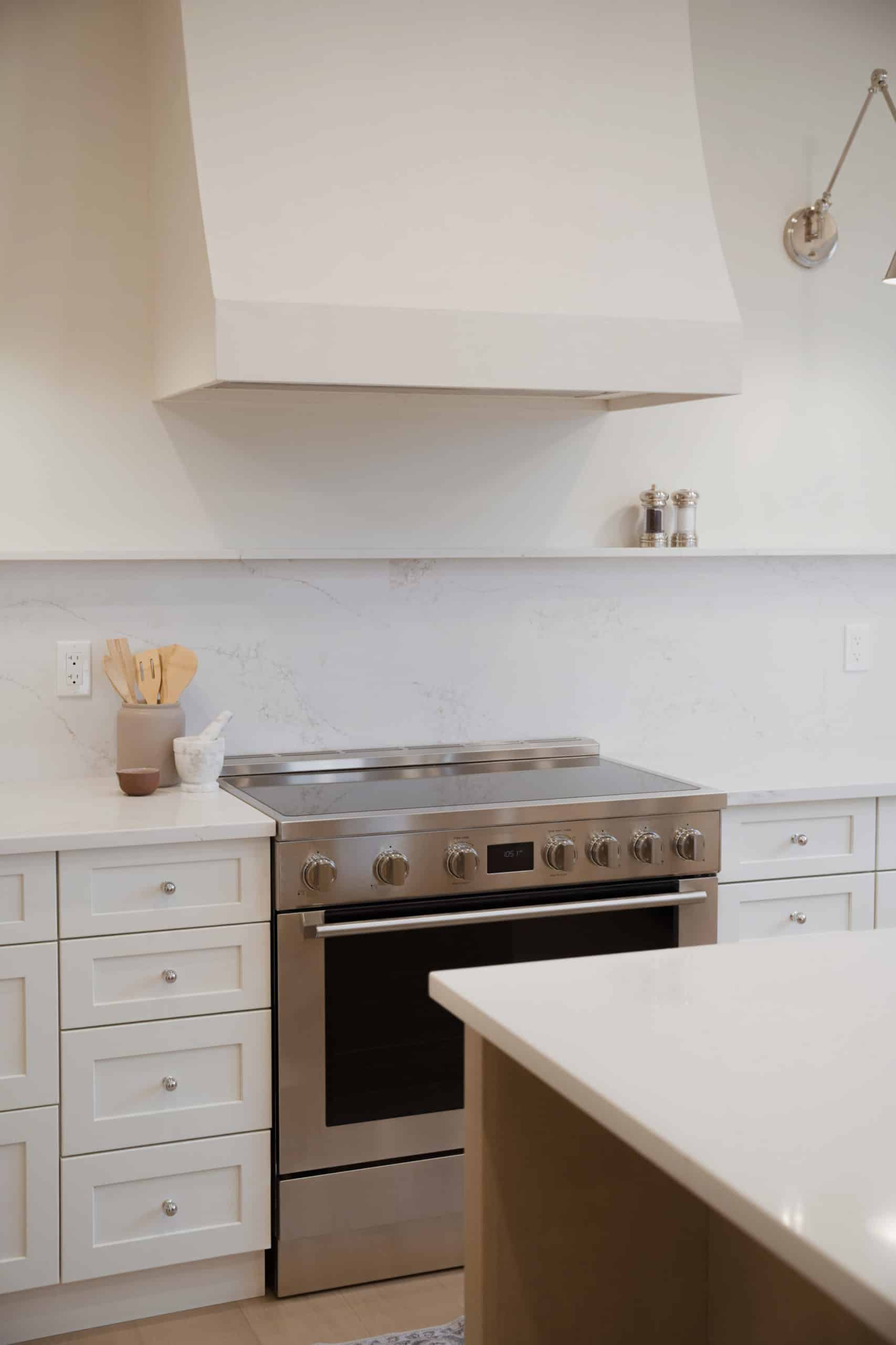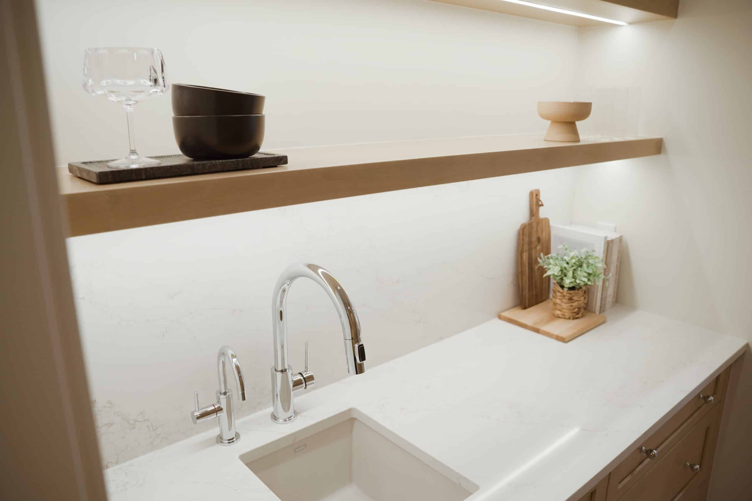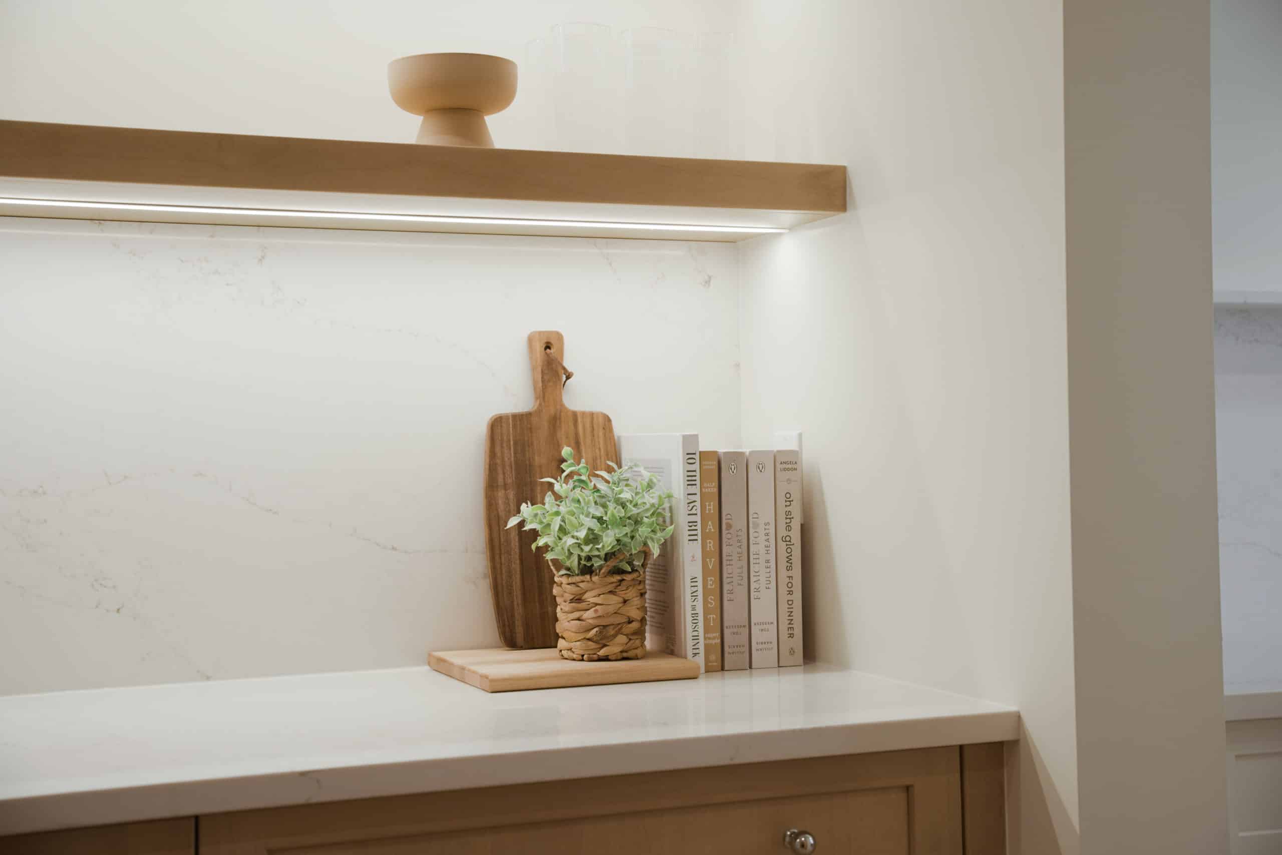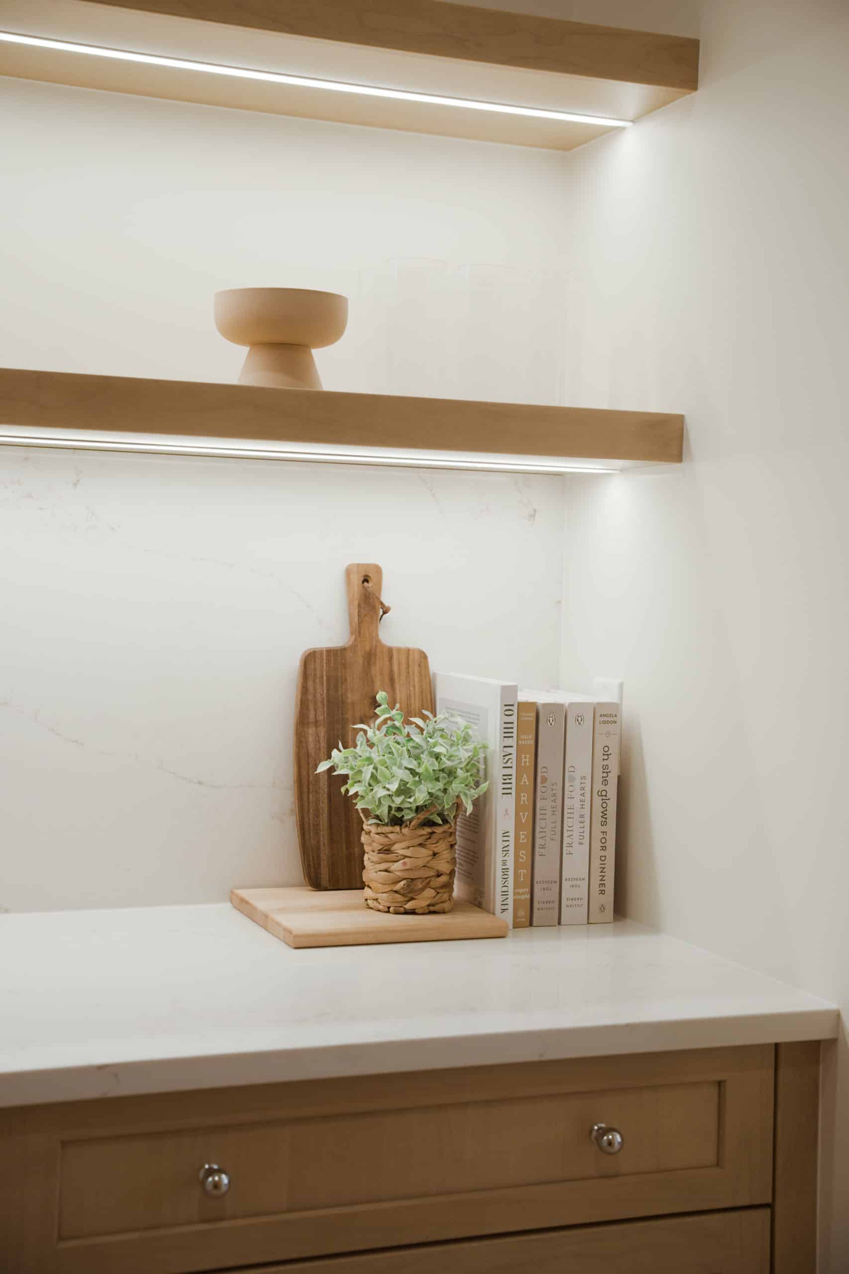 Every detail of this space was carefully considered. We installed custom cabinetry in a soft wood tone, adding a layer of warmth and natural texture to the overall palette. The quartz countertops, paired with a matching quartz slab backsplash and a floating quartz shelf, offer a clean, seamless look that balances beauty with functionality. These subtle design choices speak to a refined modern aesthetic, one that’s both timeless and family-friendly.