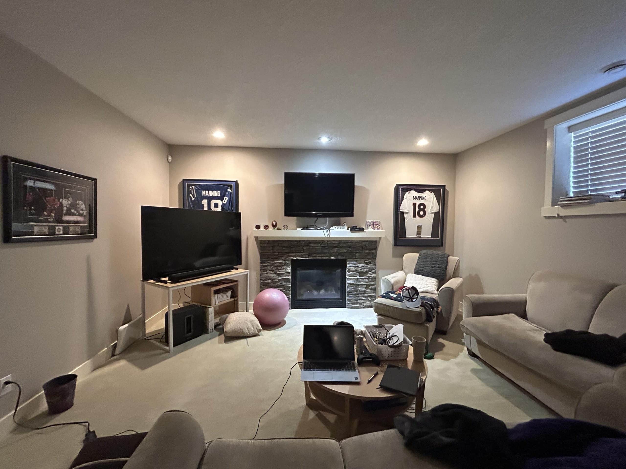 We replaced the flooring with soft, durable carpet, providing a cozy and inviting feel perfect for family movie nights or quiet reading. To anchor the living area, we added a sleek linear fireplace with a modern surround – an elegant upgrade that instantly elevates the space.
