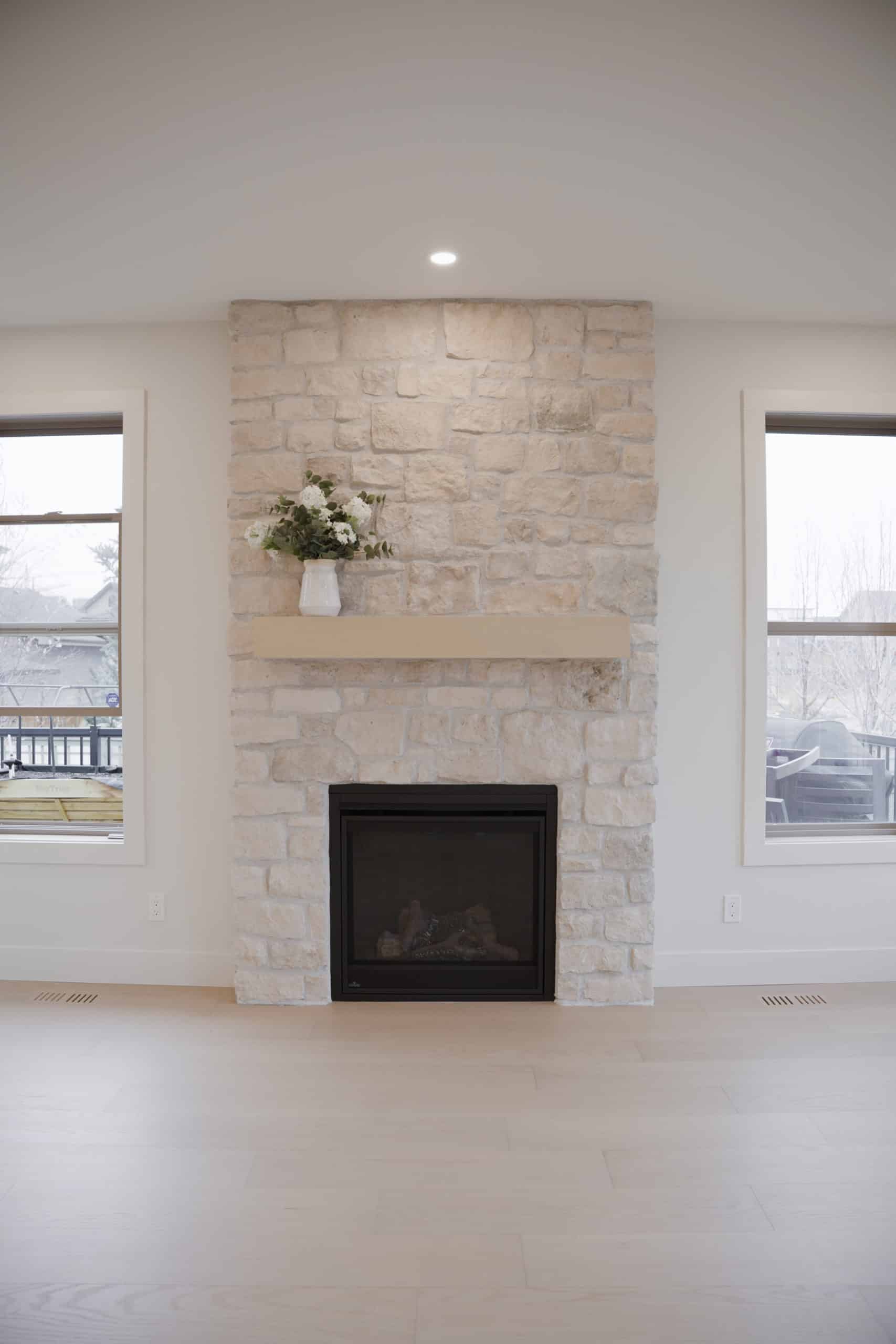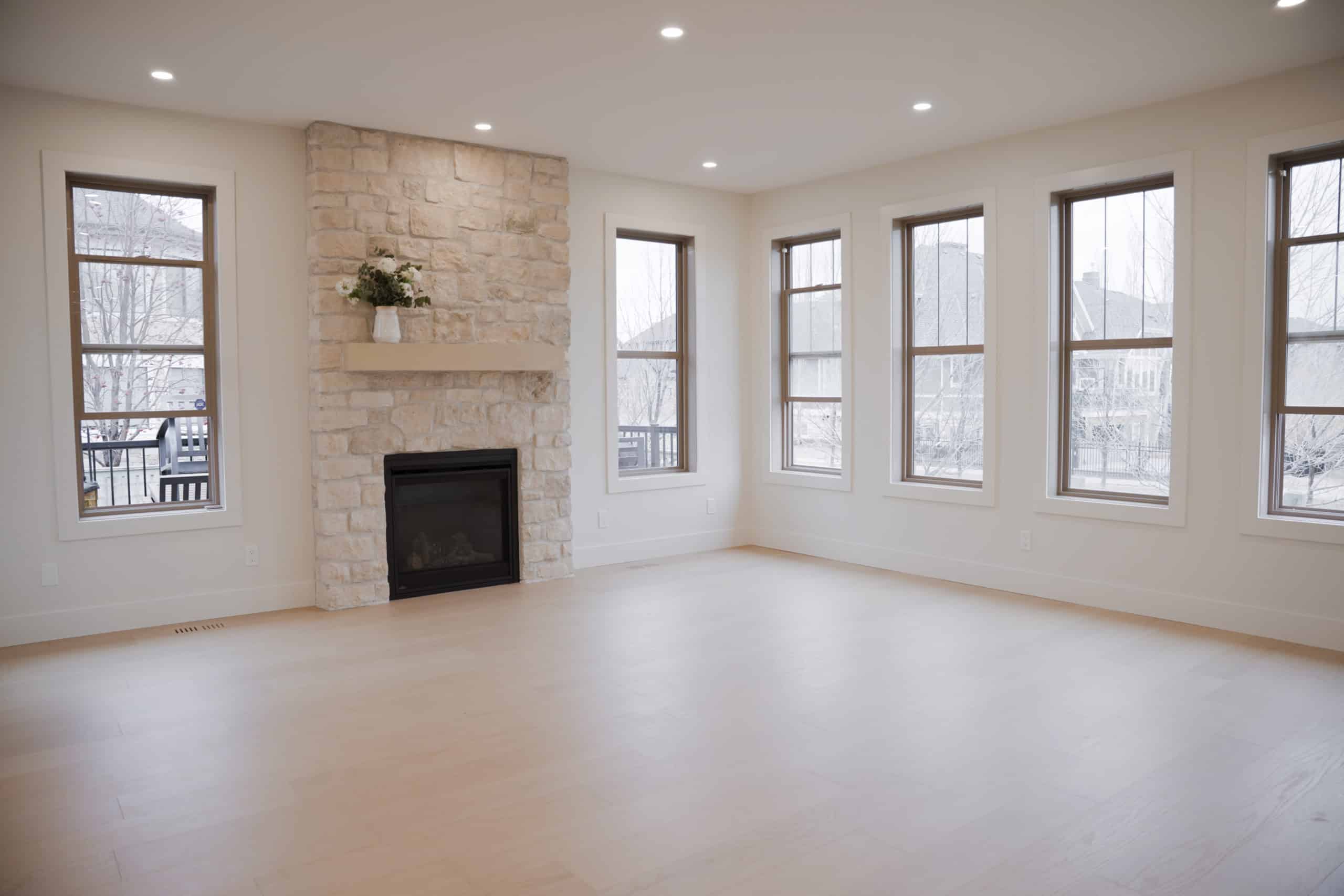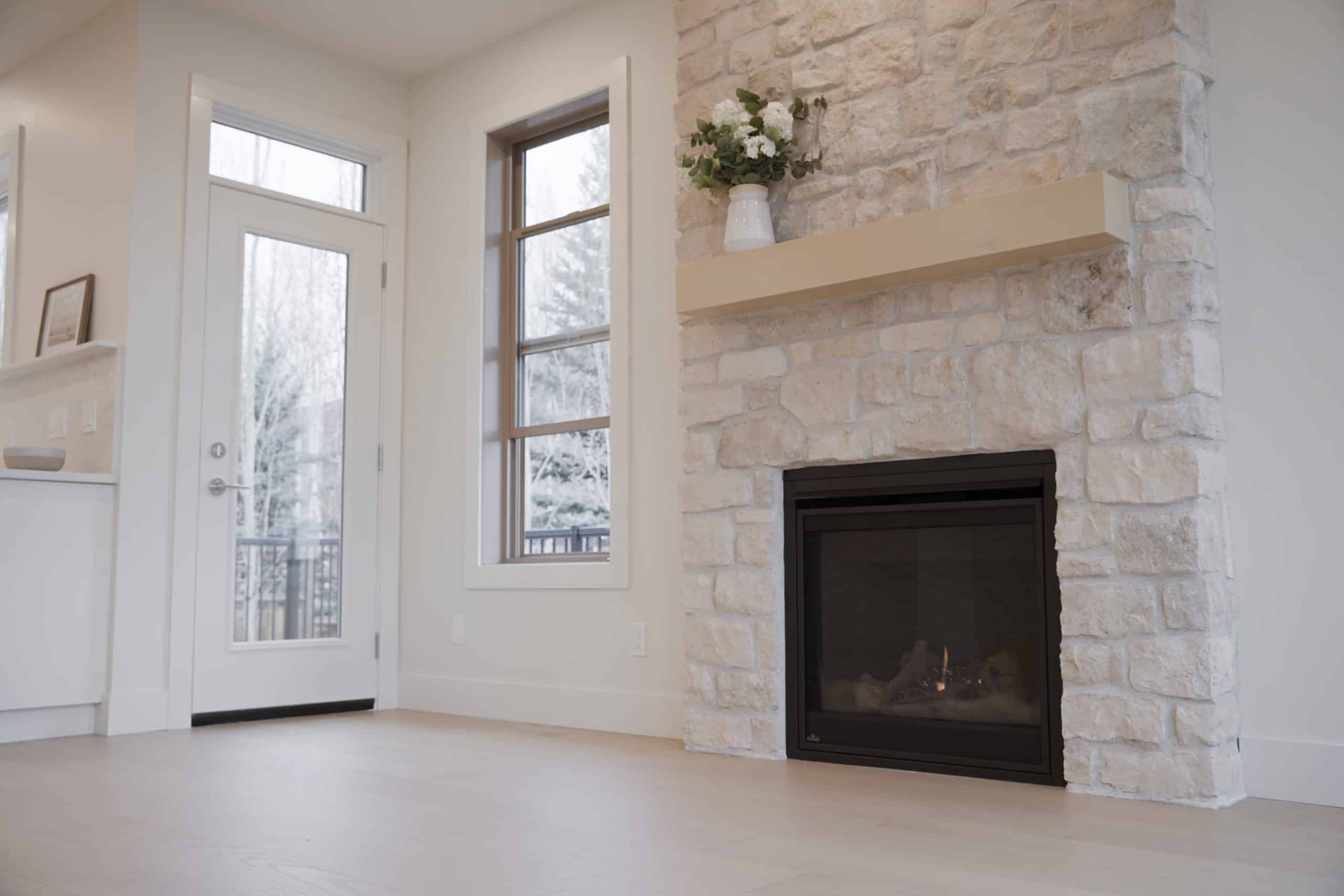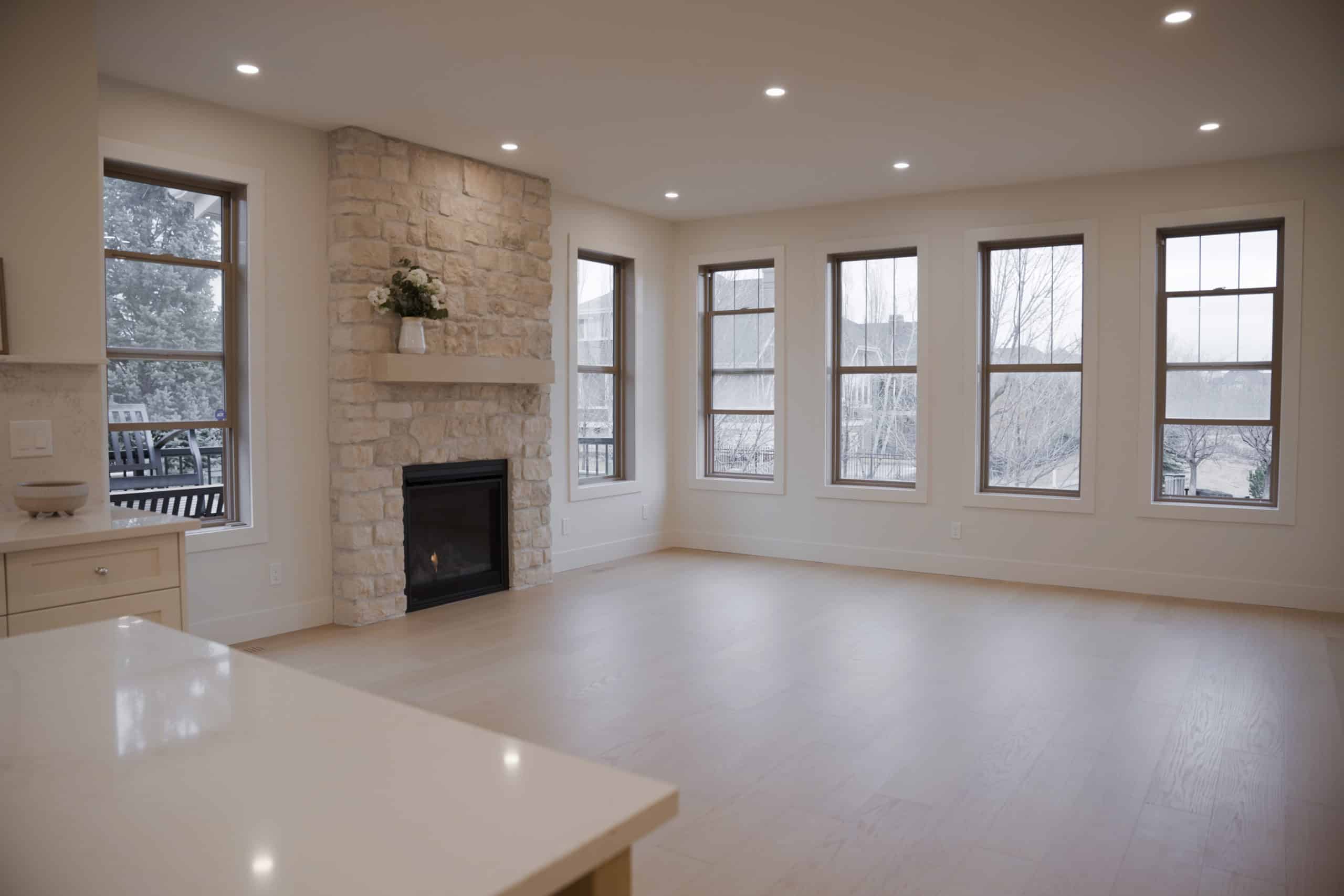 Adjacent to the kitchen, we carried the same sense of elevated design into the living room with a new fireplace feature wall. This focal point provides warmth and cozy ambiance while grounding the main floor visually. It’s a natural extension of the kitchen’s refined material palette, helping to establish continuity and cohesion across the space.