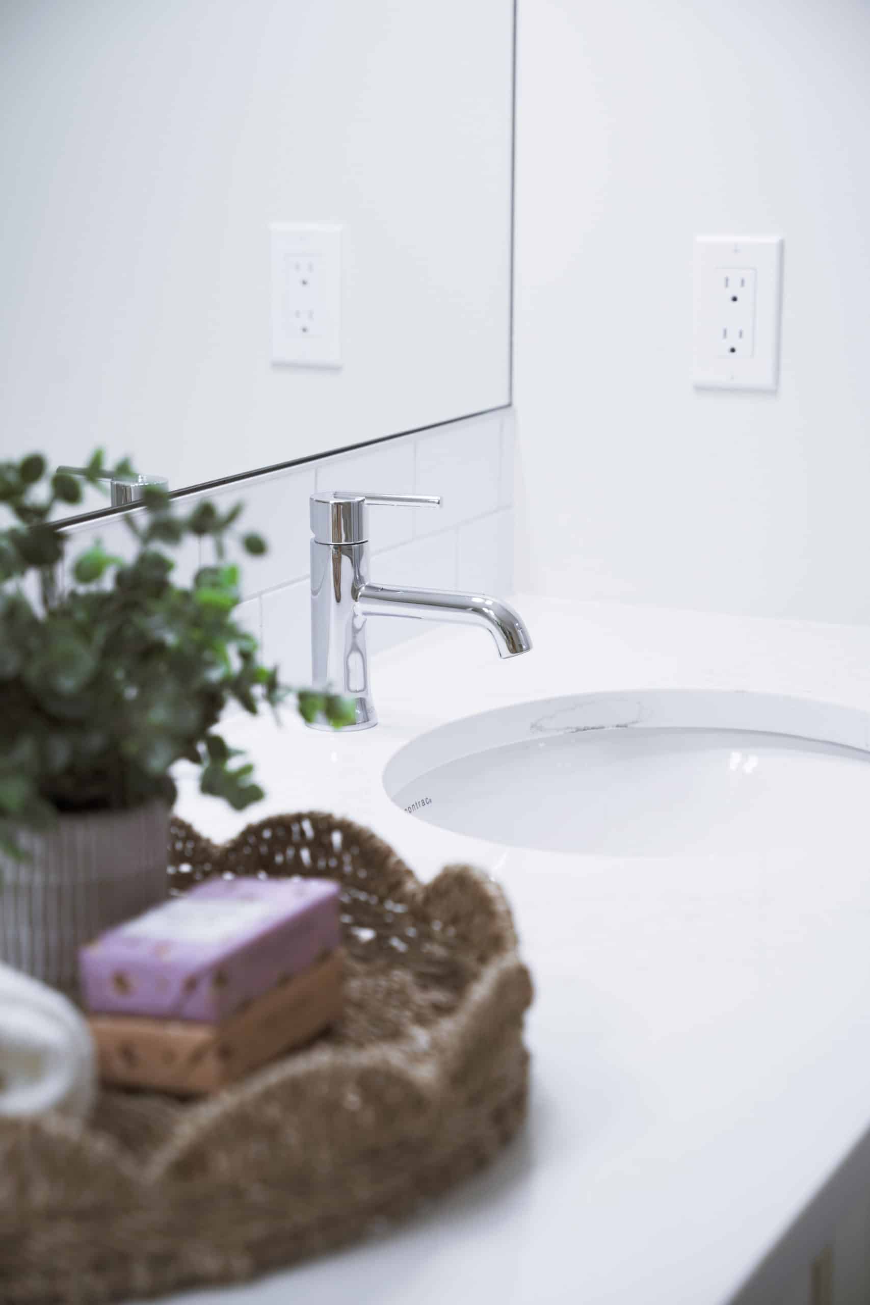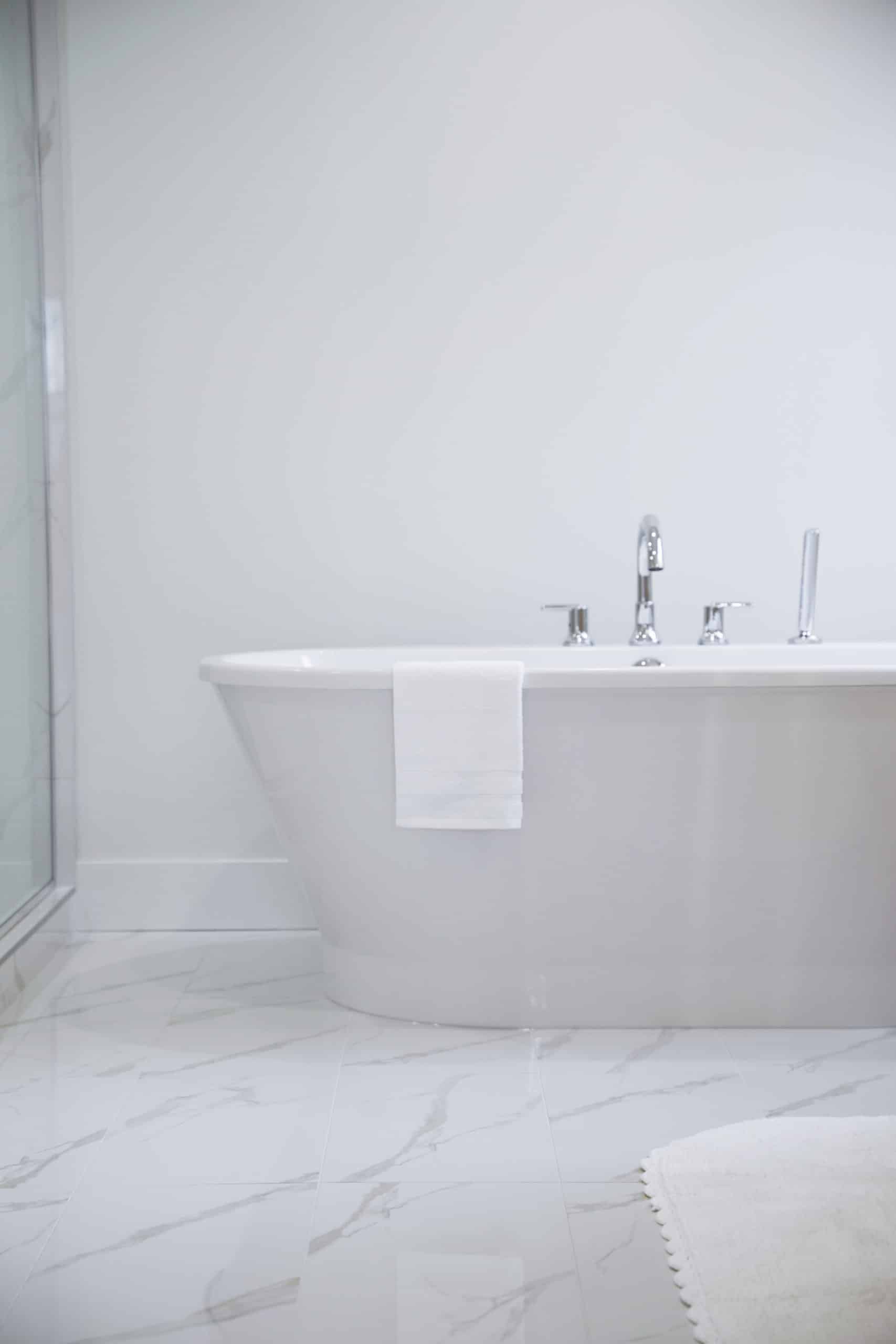 • A double vanity with quartz countertops, quartz backsplash, ample drawer storage, offering both partners dedicated space.