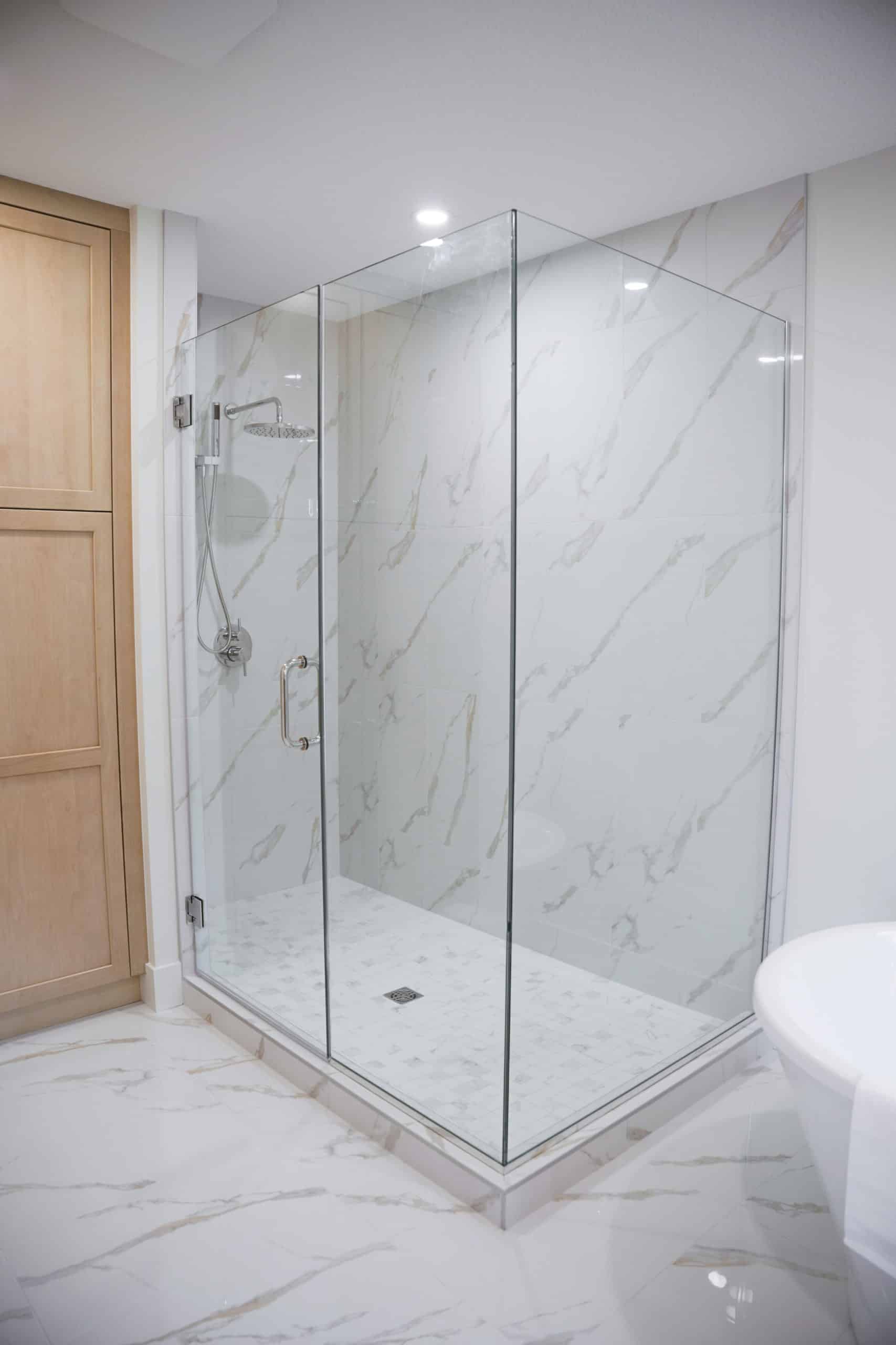 • An oversized, custom walk-in shower with frameless glass and refined tilework.
