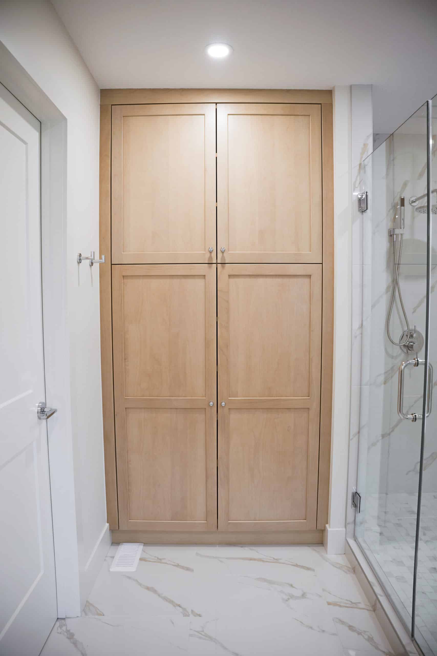 • A full-height, full-width linen cabinet, seamlessly built-in for streamlined organization.