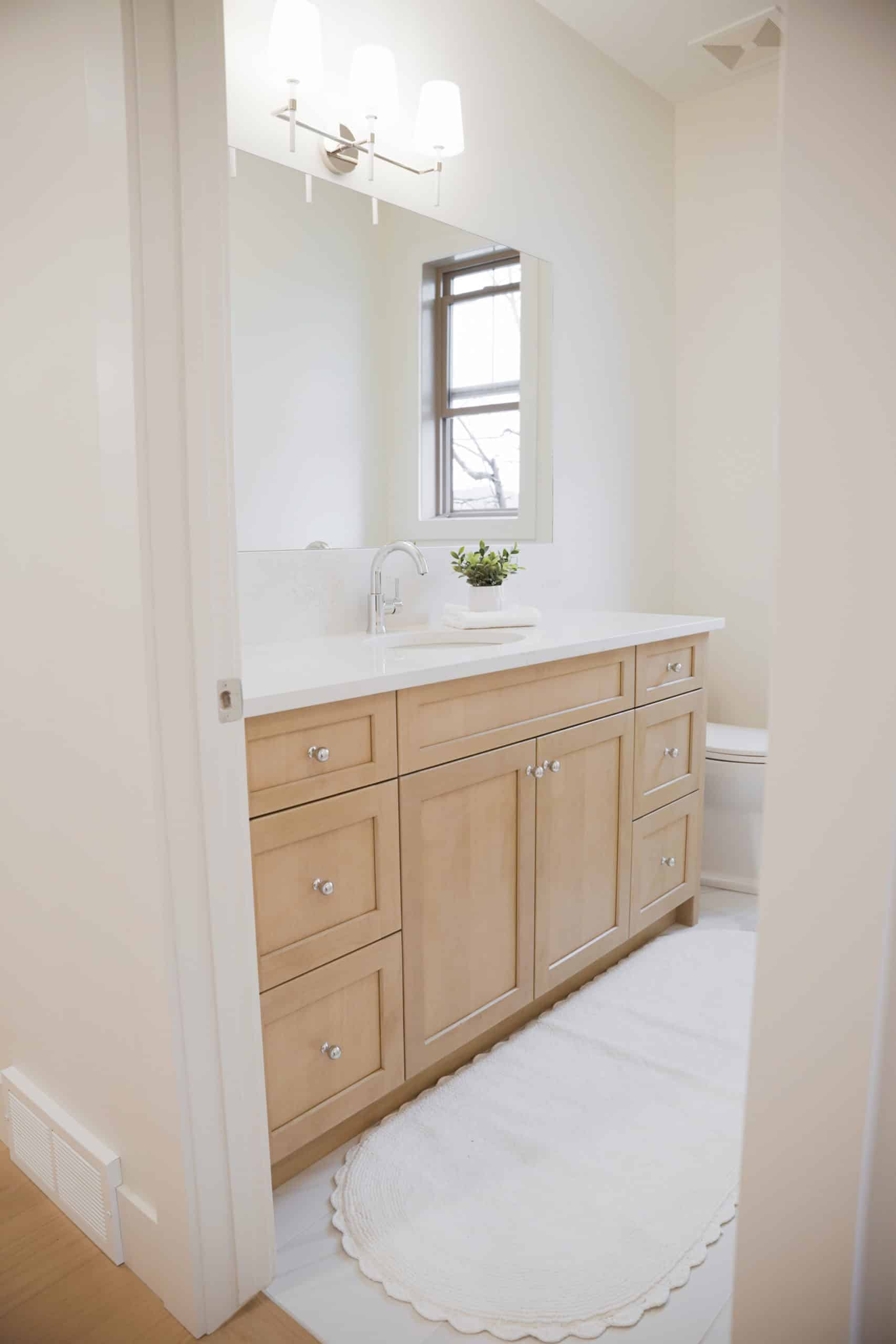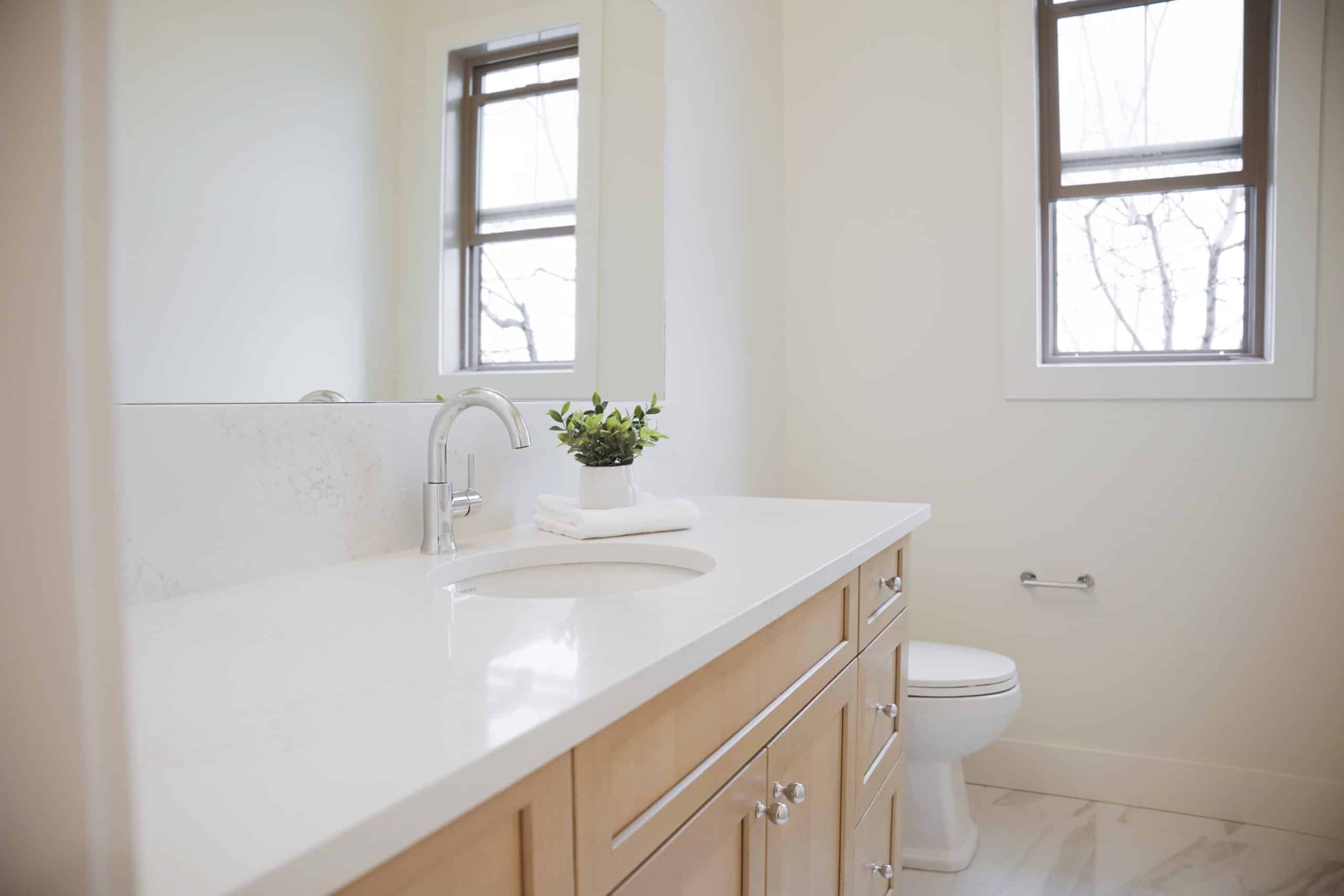 A new, fresh powder room ensures guests have convenient access to a bathroom without needing to use the upstairs or basement spaces. The design is compact but stylish, with custom finishes that mirror the elegance of the rest of the home.