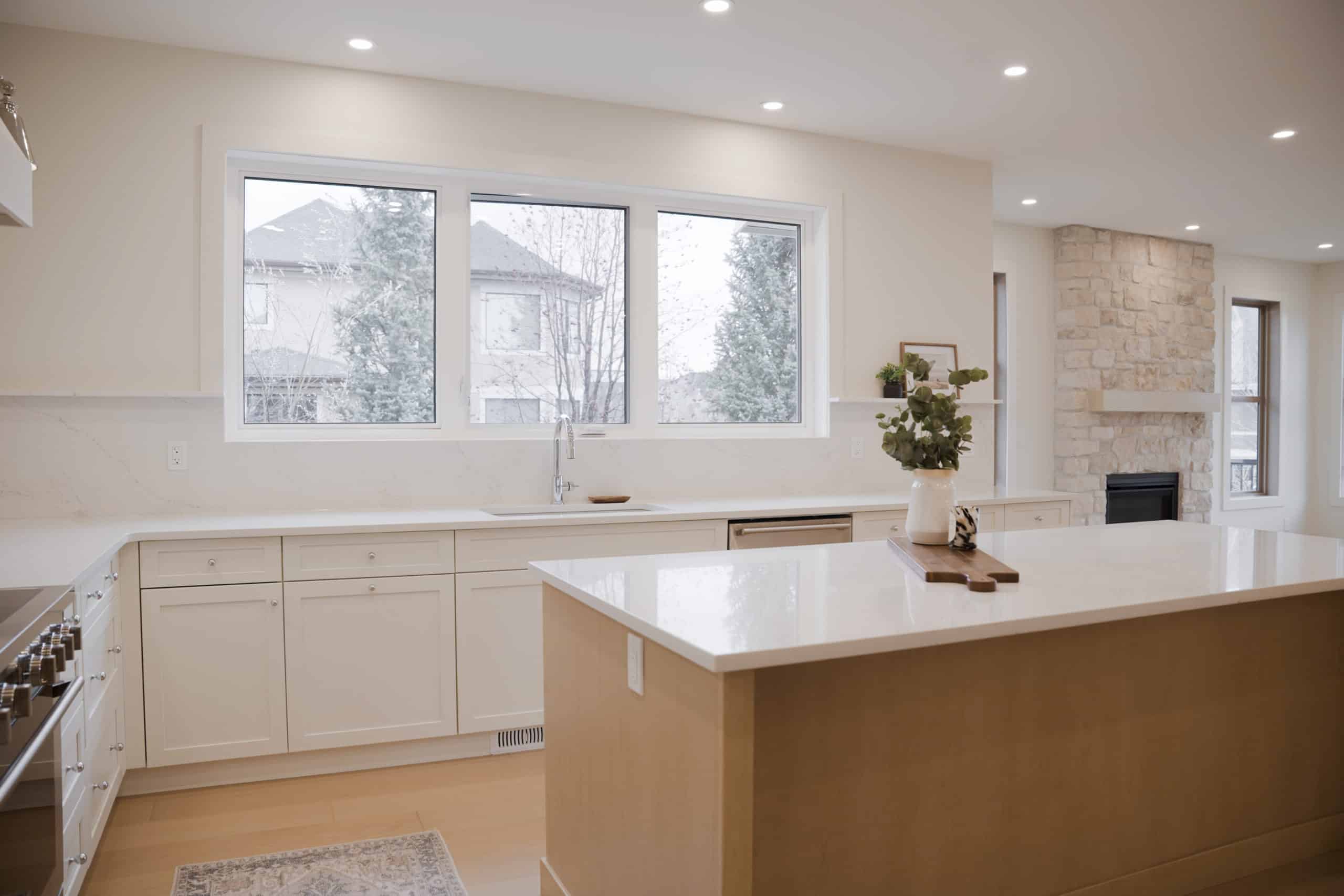 This single move reshaped the flow of the entire main floor. The result is a bright, welcoming, and thoughtfully designed custom kitchen that now acts as the true anchor of family life. With large new windows installed above the sink, the kitchen is flooded with natural light and offers stunning views into the backyard – a simple, yet powerful shift that invites the outdoors in.