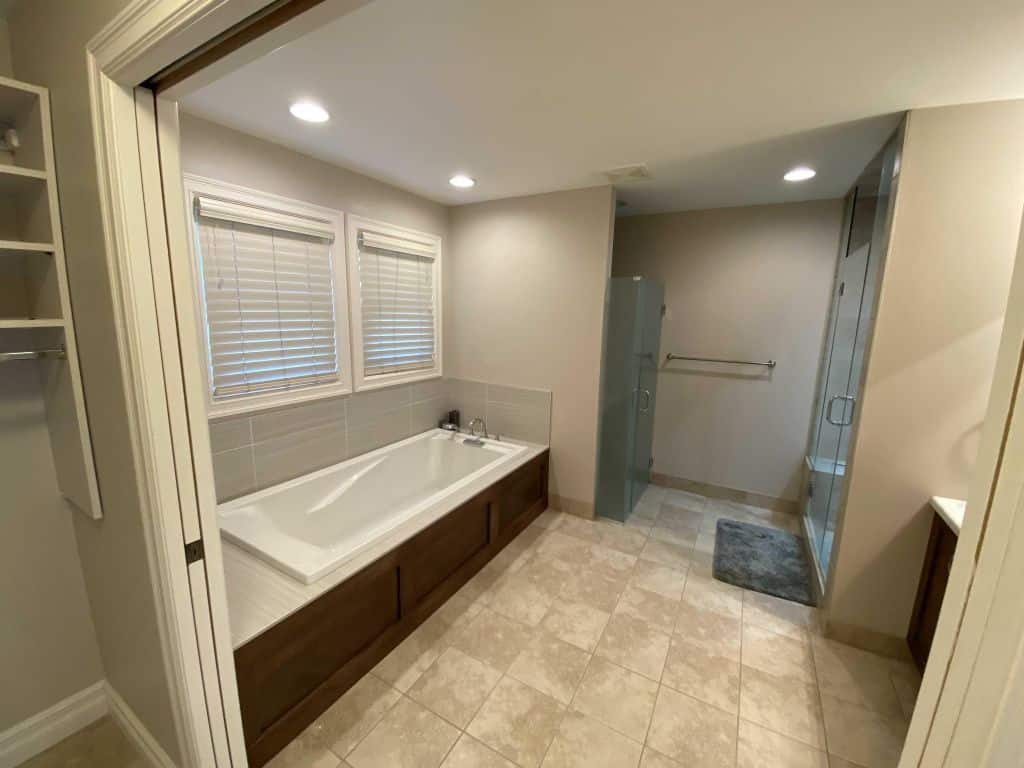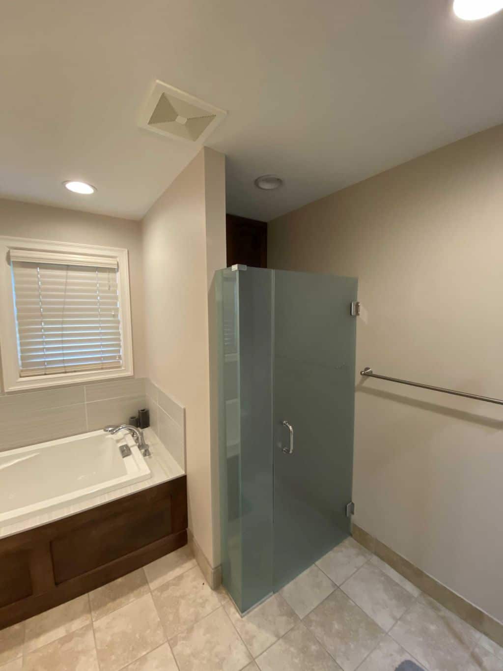 A walk-in glass shower, complete with a rainfall showerhead and polished fixtures, creates an invigorating experience that still feels calm and serene. Across the room, a freestanding soaker tub offers the perfect place to unwind, surrounded by elegant finishes and softly diffused light.