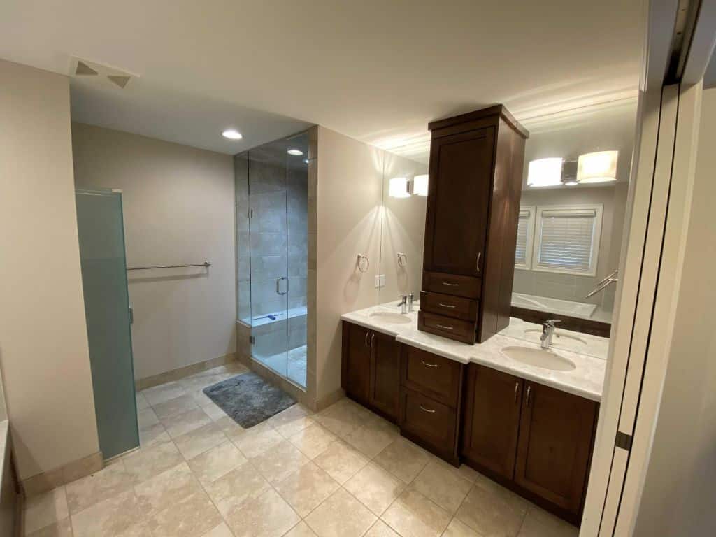 The custom double vanity provides both beauty and utility, with ample storage, quartz countertops, and refined hardware that complements the rest of the home’s design language. Luxurious tilework, selected for its subtle pattern and texture, wraps the space in visual warmth while remaining clean and timeless.